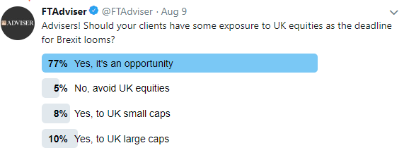 According to the latest FTAdviser Talking Point poll, 77 per cent of advisers thought being invested in UK stocks was an opportunity, while a mere 5 per cent said clients should avoid having any exposure to the asset class in portfolios.